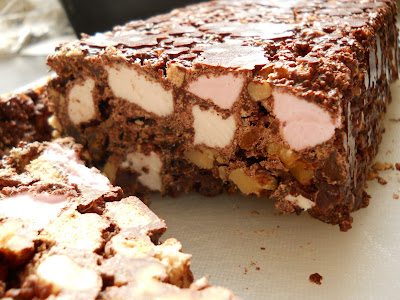 Whilst the chocolate was melting, sous chef J had a busy time making sure the Digestive biscuits were broken up and I cut the marshmallows into smaller pieces (obviously, if we'd had the small GF marshmallows, this step would not be needed). I also chopped up the walnut pieces a little but the sultanas were left whole.